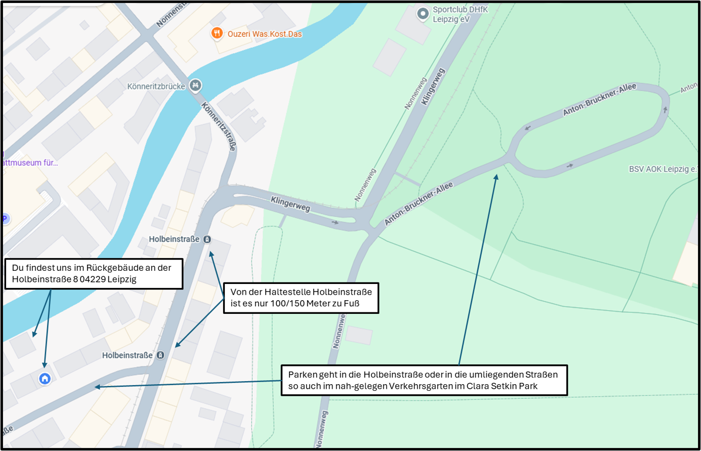 Diese Adresse ist gut eingebunden im öffentlichen Verkehrsnetz der Stadt Leipzig. Vom Hauptbahnhof kommst du am einfachsten bei uns mit Tram 1 in der Richtung Lausen, Haltestelle Holbeinstraße.